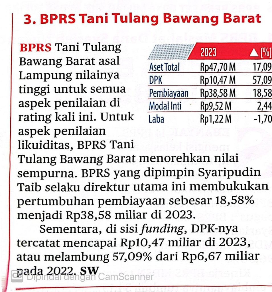 Alhamdulillah Bprs Tani Tulang Bawang Barat (Perseroda) mendapatkan peringkat ke-3 dari “INFOBANK” DENGAN KATAGORI; BPRS berasset Rp25 MILIAR s.d. < Rp50 Miliar.