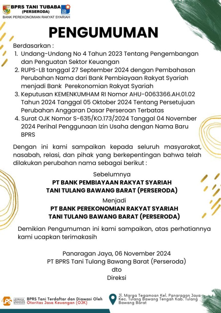 PT BANK PEMBIAYAAN RAKYAT SYARIAH TANI TULANG BAWANG BARAT (PERSERODA) menjadi PT BANK PEREKONOMIAN RAKYAT SYARIAH TANI TULANG BAWANG BARAT (PERSERODA)