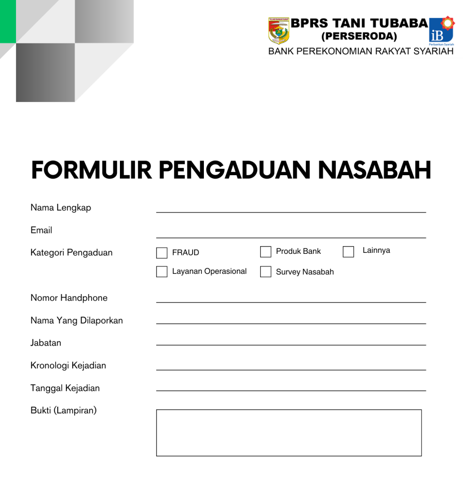 Laporan Pengaduan Nasabah merupakan sarana yang diberikan kepada nasabah dalam menyampaikan informasi indikasi pelanggaran akan ditindaklanjuti sesuai dengan mekanisme yang berlaku.